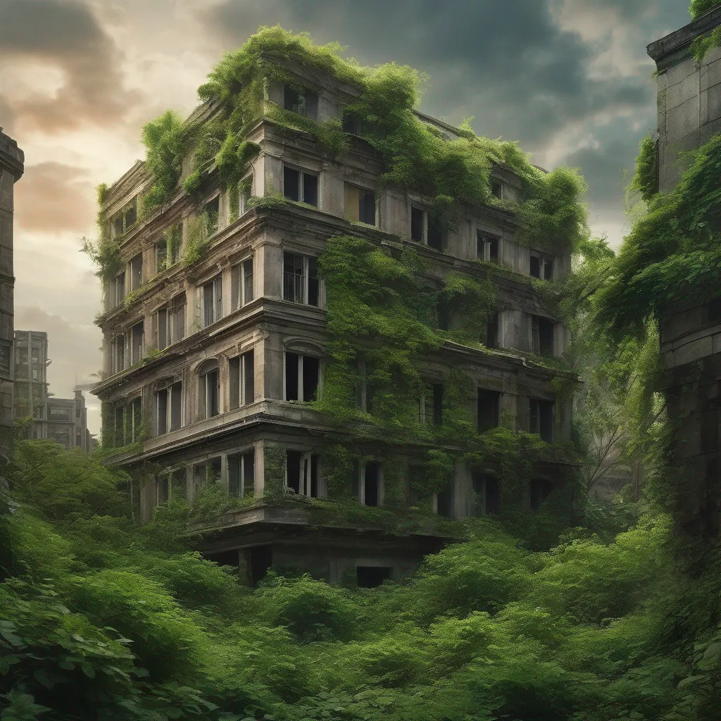 A crumbling building with overgrown vegetation under a cloudy, polluted sky.