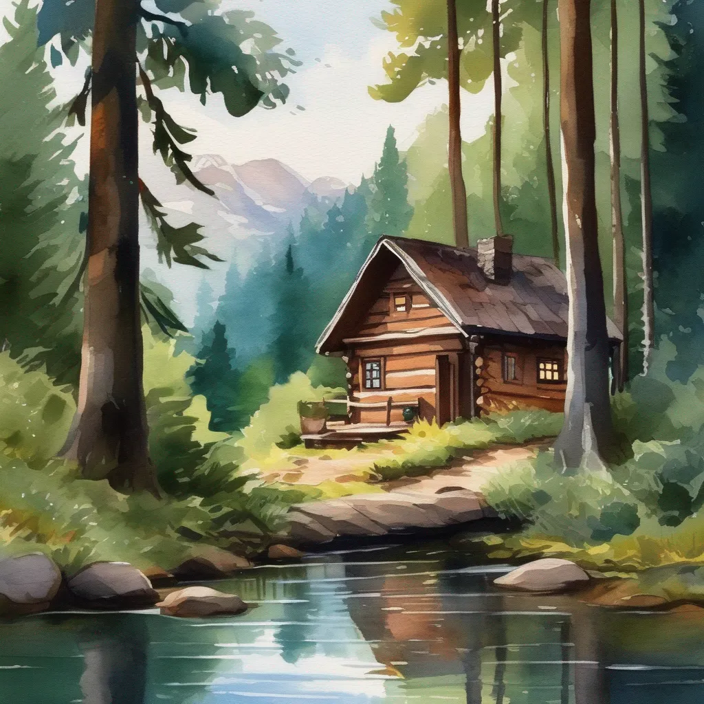A small, hand-painted postcard scene of a cozy cabin in a forest.
