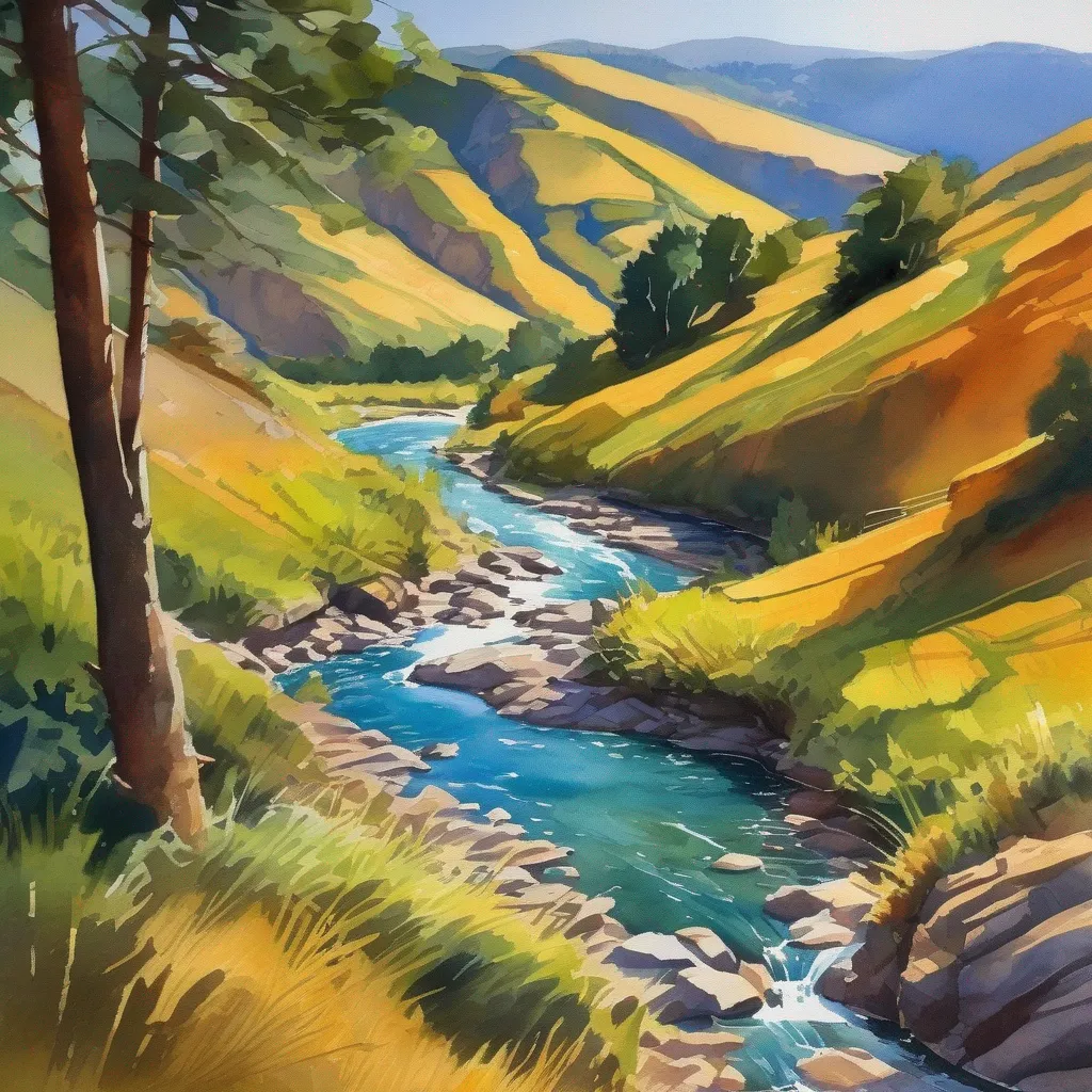 A vibrant gouache landscape showing a winding river cutting through a sunny valley, with thick, textured brushstrokes and rich, blended colors.
