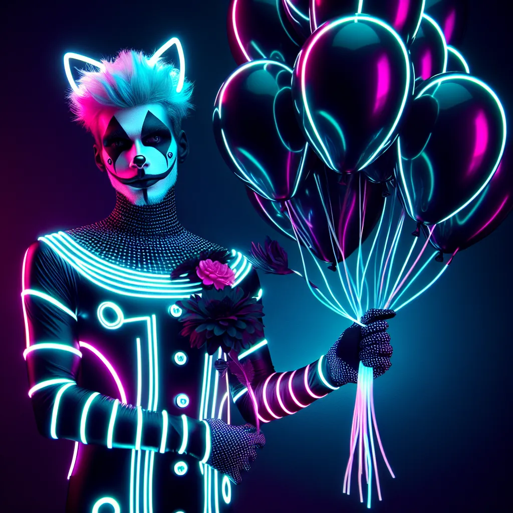 A clown wearing a monochrome feline-inspired costume with coordinating black and white face paint, grasping a cluster of black balloons that are lifting him off the ground.