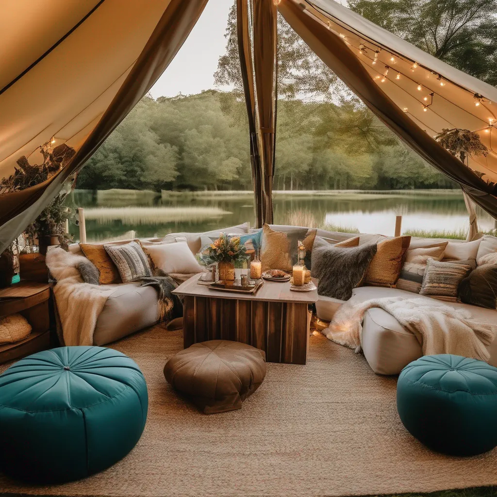 Design an upscale outdoor glamping birthday celebration featuring 2 spacious bell tents; one for sleeping and one for relaxation, lounge and party area. Outdoor inflatable movie screen for an evening cinema experience.