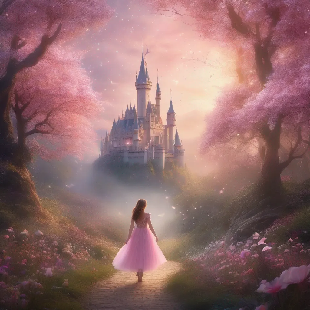 Create a fantasy-style image featuring a young girl walking through an enchanted forest surrounded by sparkling fairies, amidst pink-hued trees and flowers. In the distance, a majestic castle looms, encapsulating an atmosphere of magic and splendor.