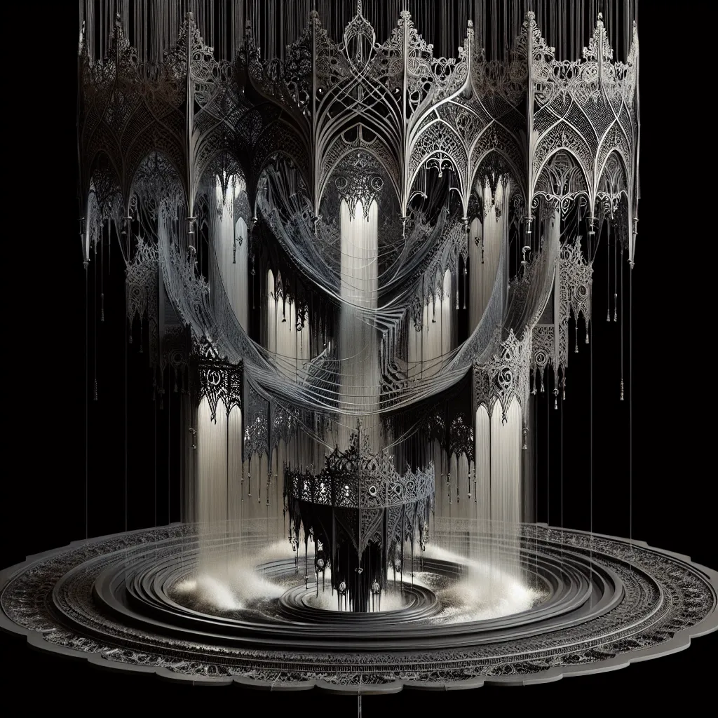 Creates 3D Image with dark, moody aesthetics, incorporating architectural elements from the Gothic era