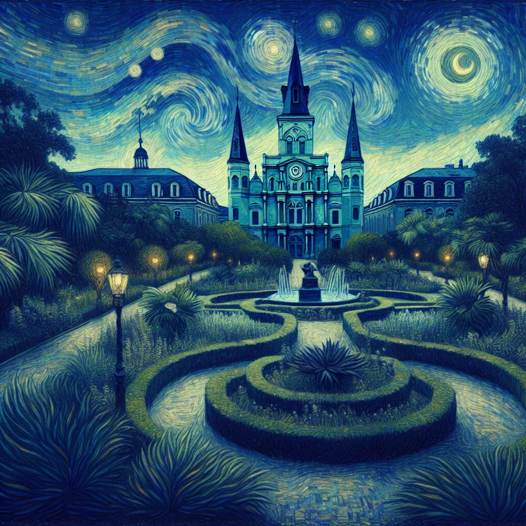 Garden in Jackson square(including statue of Andrew Jackson in horseback) and a large view of St. Louis Cathedral (New Orleans)