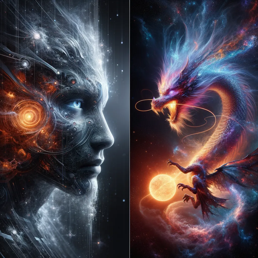 Dramatic digital painting. A celestial dragon bursts forth from a dying star, its scales ablaze with cosmic fire, soaring across the vast expanse of the universe, leaving trails of stardust. Hyperrealistic rendering, intricate detail, atmospheric depth. Best quality, a masterpiece, 8k resolution, stunning, dramatic, complementary colors, chiaroscuro, high contrast.