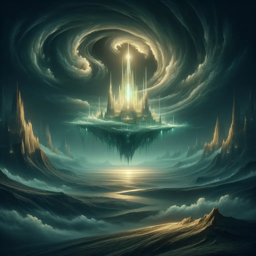 A mysterious luminescent floating island, bathed in an eerie glow, hovers ominously in the darkened sky. This captivating image is a digital painting, meticulously rendered with stunning detail and depth. The island's twisted spires reach upwards, their surfaces gleaming with an otherworldly light, casting long shadows over the desolate landscape below. The swirling clouds above add an air of suspense and mystery, drawing viewers into a hauntingly beautiful and atmospheric scene.