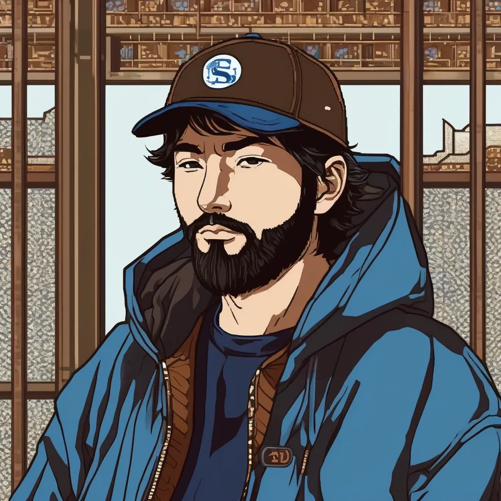 Can you create an image of of a man with light blue eyes, a neatly trimmed brown beard, and short brown hair. He is wearing a black baseball cap with a white "SOX" logo. His attire includes a blue hooded anorak-style jacket with a half-zip closure. On the front of the jacket, there is a rectangular "NAPAPIJRI geographic" logo and a small rectangular flag, which appears to be the flag of Norway, positioned below the logo.