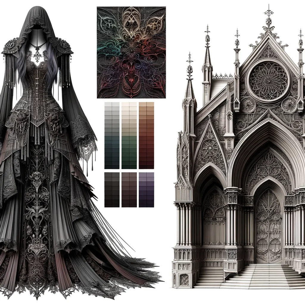Creates 3D Image with dark, moody aesthetics, incorporating architectural elements from the Gothic era