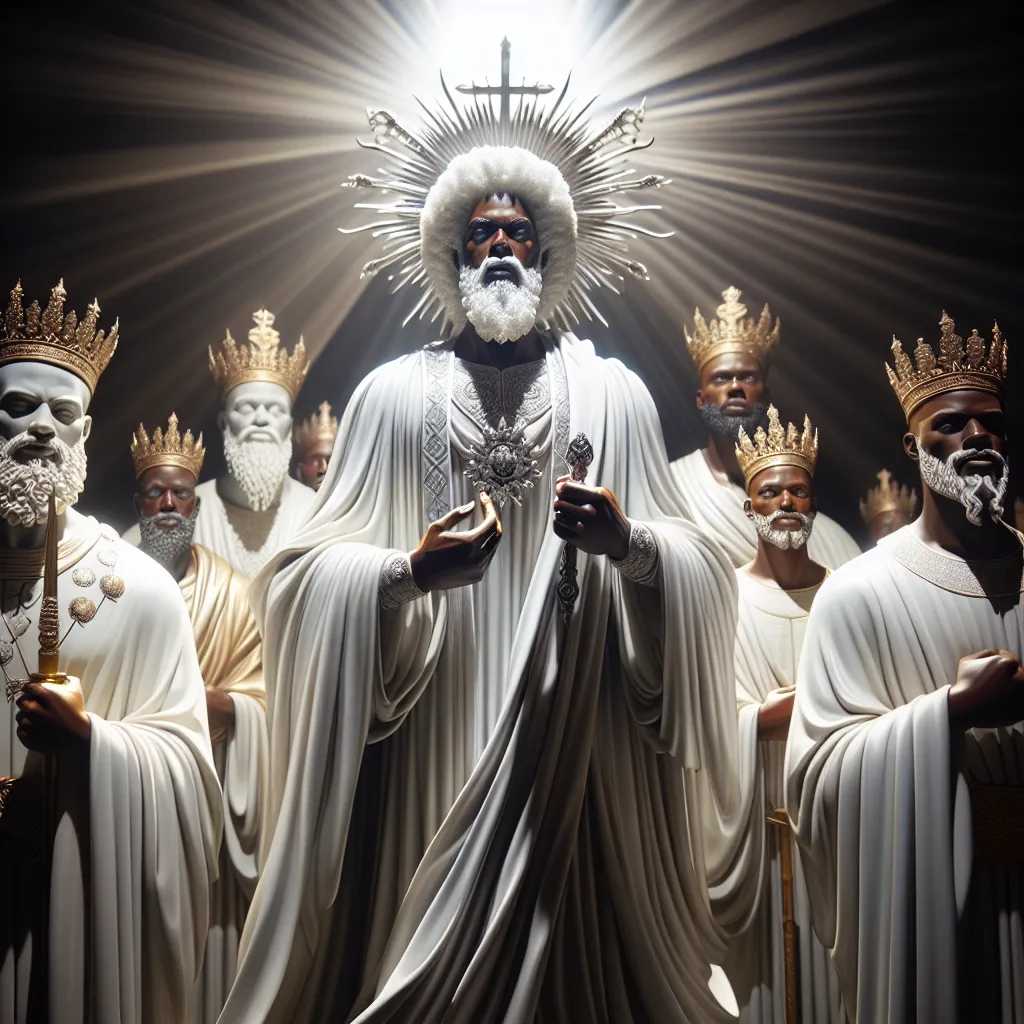 Surrounded by many black men in crowns. A majestic and powerful Black Christ, portrayed with a striking contrast against bright light, stands tall with a white afro, crown, and sword. His white hair, beard, and flowing robe give him an ethereal presence. This description paints a vivid picture of a painting showcasing the divine figure in a dynamic and awe-inspiring manner. The details of the figure's appearance are meticulously rendered, creating a visually stunning and impactful image that evokes a sense of reverence and strength.