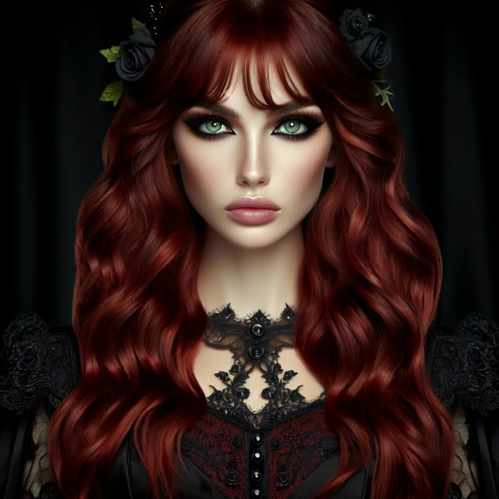 A beautiful lady, long red wavy hair with bangs, green eyes, elegant gothic dress, dark feminime energy