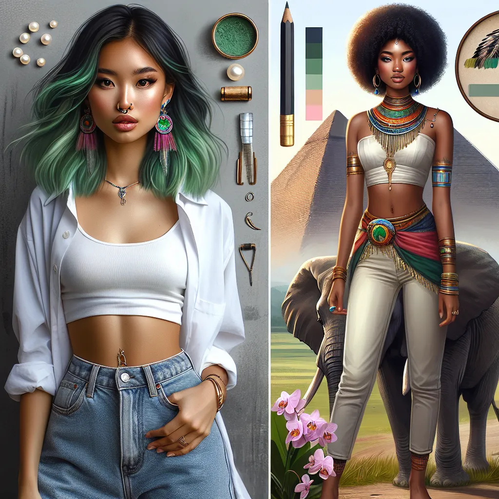 A African woman warrior standing with a elephant, with a pyramid behind them. With African violets by the pyramids and 9 pearls