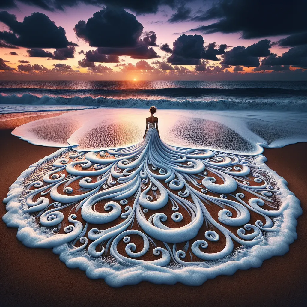 A panorama of seafoam waves coming ashore at sunset to create an artistic version on the sand of a lady in a large swirling dress standing on the beach Just after sunset