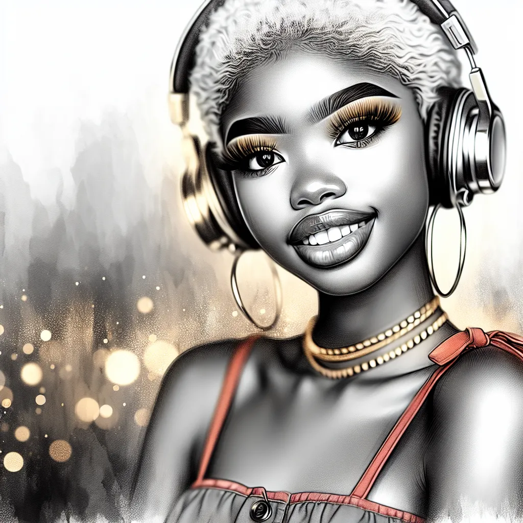 A most ravishing, ink wash, slightly stunning beautiful, sharp and detailed, portrait of a smiling 17 year-old, African American blonde girl with full lips long fluffy lashes, gold makeup bright brown eyes, silky skin, voluminous fashionably styled short length hair.gold jewelry. Her body stance on the left side. Wearing a shoulders revealing cute summer little red dress and big headphones to her head. Allow clear space and margin around the girl. bokeh background 4k HDR