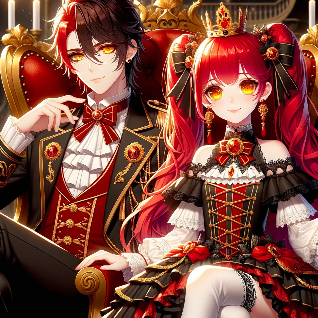 Lilith as a girl with elegant gothic lolita dress sit beside handsome lucifer, the girl has red hair and golden eyes, thrones