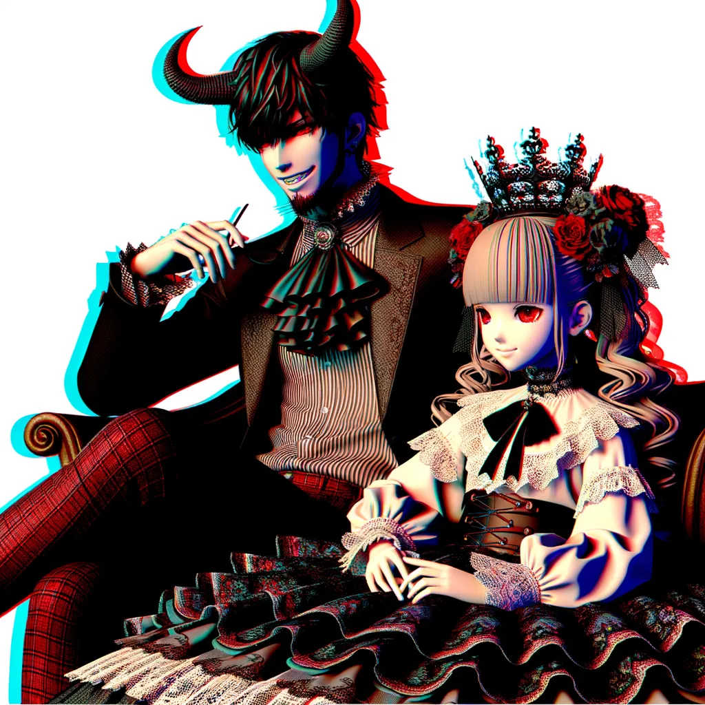 A girl named lilith with elegant gothic lolita dress sit on the lap of Handsome Lucifer with Black Horn, Msyterious Aura of Black and red, Lilith and Lucifer evil smirks, glowing eyes, 3D, High Res