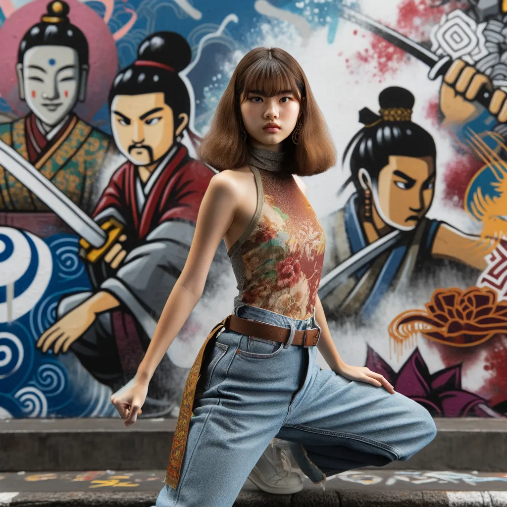 Attractive, Asian teenage girl, long brown hair and bangs, wearing tight skinny jeans and a halter top paint marks on her clothing, backside view heroic pose Asian graffiti