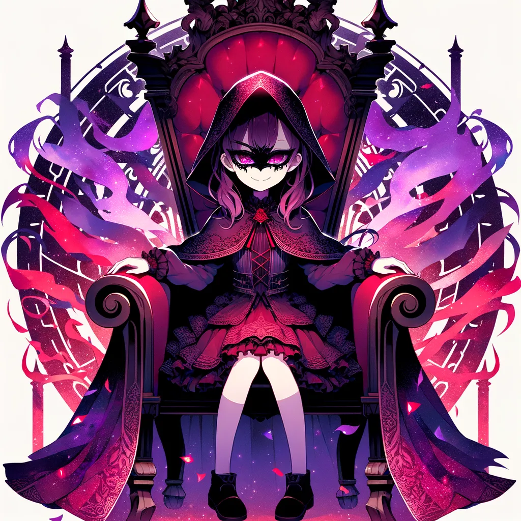 A girl named lilith wearing elegant gothic lolita dress sitting on the thrones, red purple aura, smirk evil