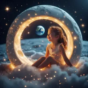 «“A glowing Moon shown . A young girl is sitting happily inside t...»