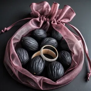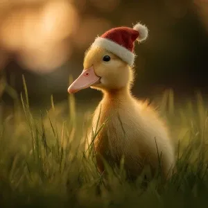 «A yellow feathered baby call duck wearing a Santa hat gently thr...»