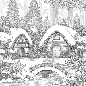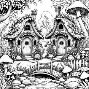 «Whimsical fantasy garden scene in detailed black-and-white line...»