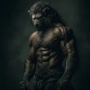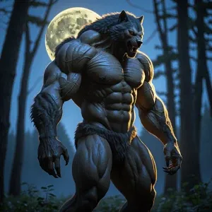«In a moonlit forest clearing, envision a fearsome lycanthrope to...»