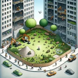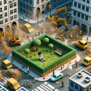 «Un pequeño parque lleno de árboles, pasto y pájaros. Un niño est...»