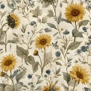 «vintage farmhouse botanical repeat pattern, scattered sunflowers...»