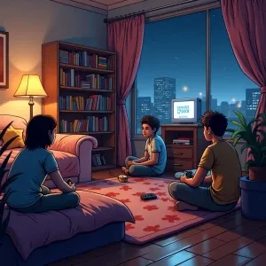 «Step into a cozy 1990s living room on a Friday night sleepover w...»
