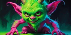«In vivid hues of neon greens and pinks, a plush goblin twists an...»