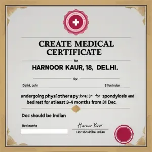 «create a medical certificate for Harnoor Kaur,18 Y, delhi.. Unde...»