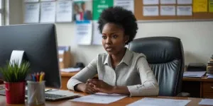 «Africa girl sitting in the office, speak about upcoming meeting...»