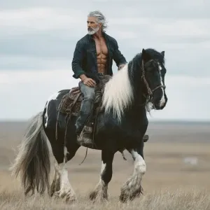 «A bodybuilder man with a rugged beard and long gray hair, dresse...»