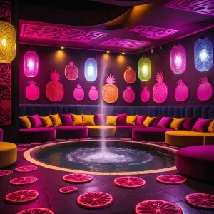 «Explore the Dragonfruit Lounge, a vivid space filled with deep m...»