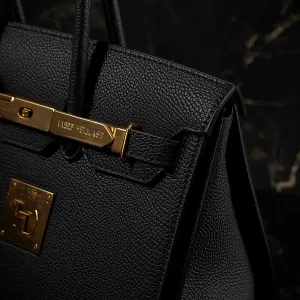 «sculptural structured luxury handbag, deep black pebbled leather...»