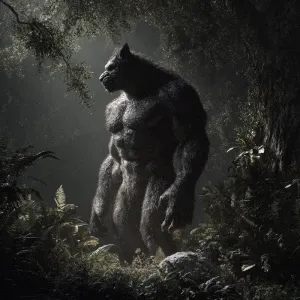 «In a moonlit forest clearing, envision a fearsome lycanthrope to...»