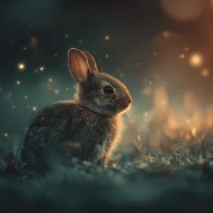 «A tiny baby rabbit sitting in soft grass at night, illuminated b...»