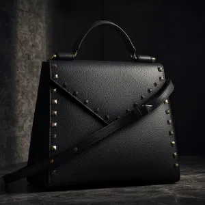 «sculptural luxury handbag, deep black textured leather, visible...»