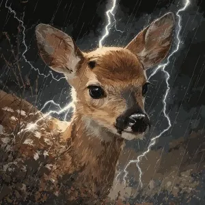 «Baby fawn standing strong in storm rain in the spring, lightning...»