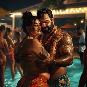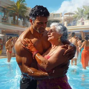 «Realistic art 1:1, summer pool party at a New York resort, captu...»