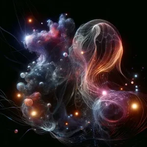 «Floating organic shapes intertwined with neon light trails, futu...»