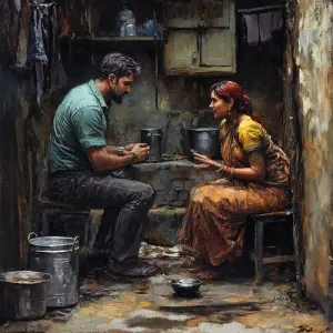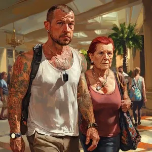 «Realistic art 1:1.A sweaty man walking with his 54 year old mot...»