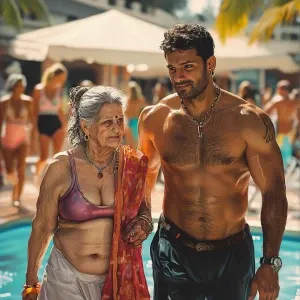 «Realistic art style 1:1,a muscular sweaty pierced man walking w...»