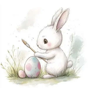 «A cute bunny sitting in a bit of grass, painting an Easter egg,...»