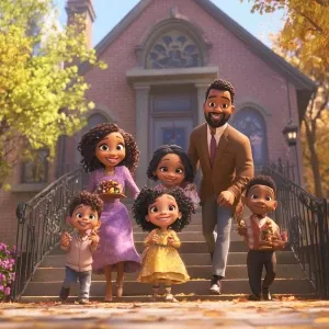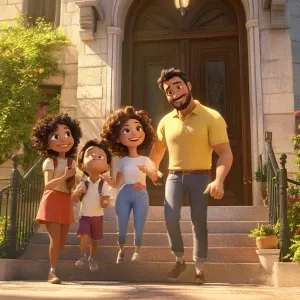 «Create an animated Pixar image of a beautiful happy biracial fam...»