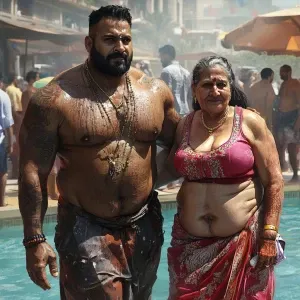 «Digital art ,a pool party new york summer resort,a muscular big...»