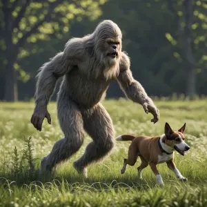 «A humanoid Sasquatch with thick fur chasing a dog across a field...»