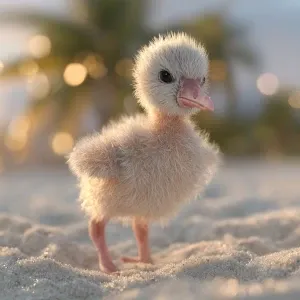 «A newborn baby flamingo chick named Flan, soft pale-gray down wi...»