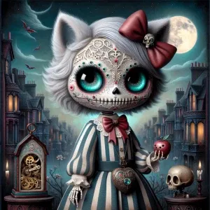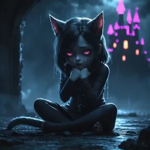 «A young demon cat sits alone in the darkness, her body trembling...»