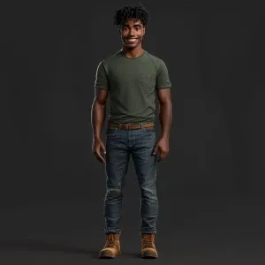 «Create a lifelike image of a man with a medium build and dark sk...»