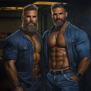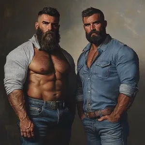 «bodybuilder men stand side by side. Both have thick, full beards...»
